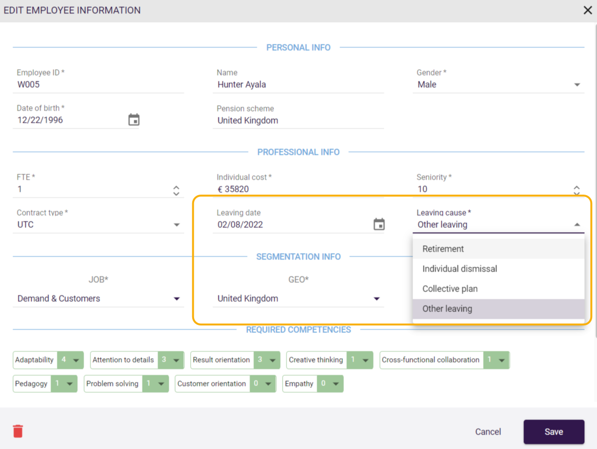 The leaving cause can be Retirement, Dismissal, Collective plan, or Other leaving.