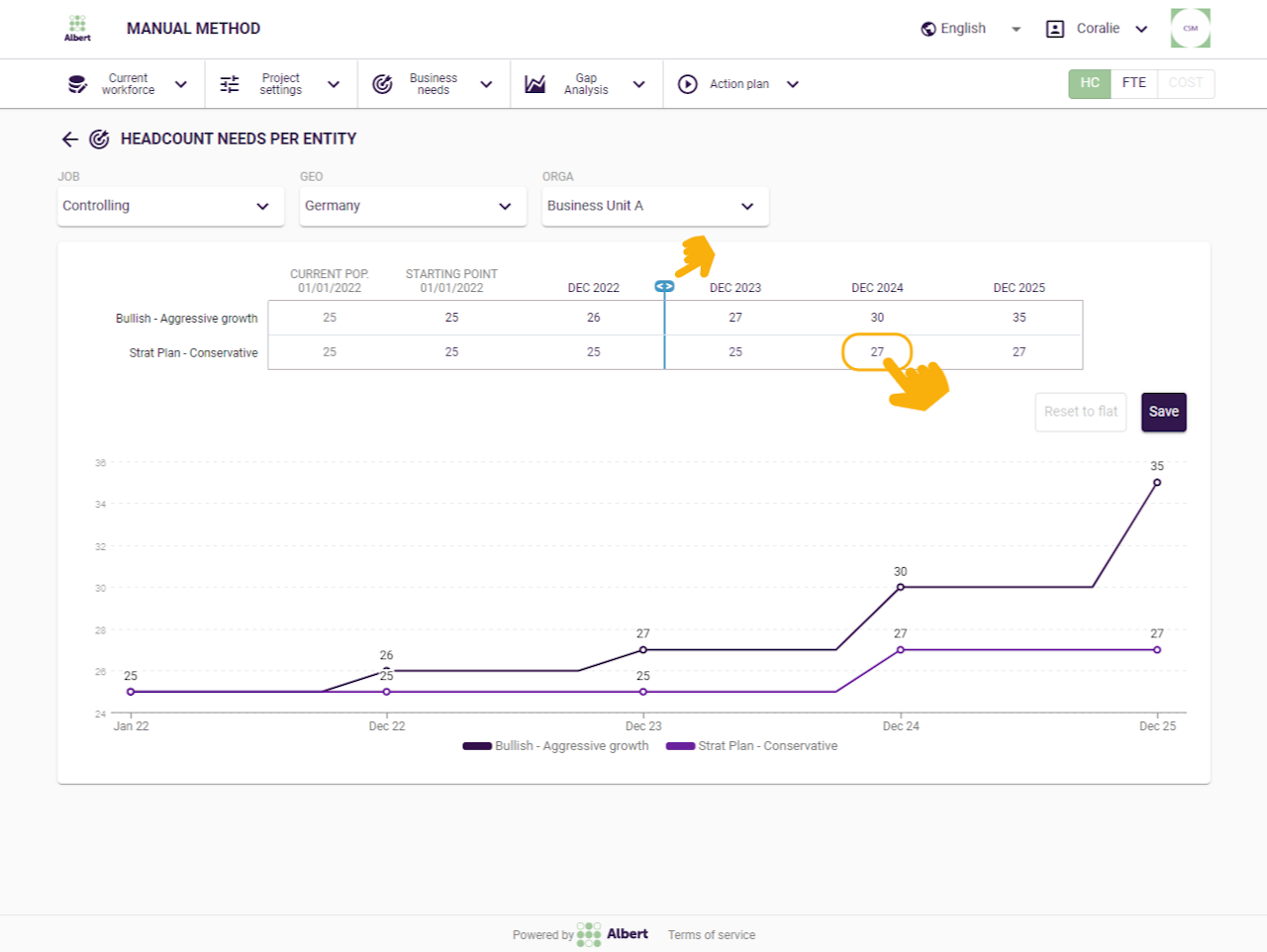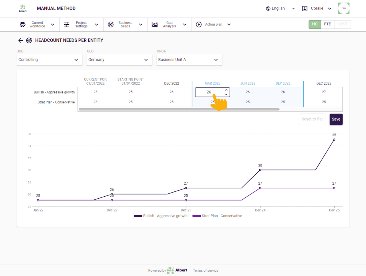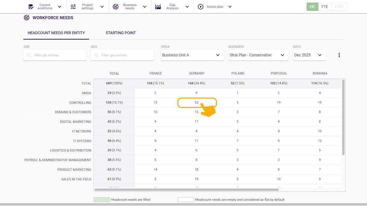 This will take you to the Workforce needs page for this entity: fill in the need for each period for each of the project scenarios. Just click in the cells to fill them in.