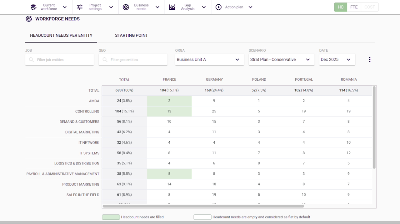 When you return to the workforce needs table (where entities are selected), you will see that the cells turn green as the needs are filled.