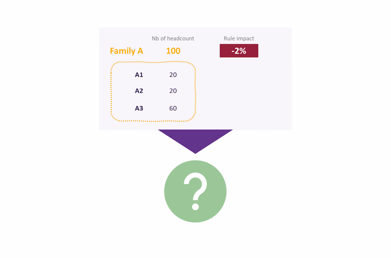 Thus, if family A has 100 people, and a driver rule with an impact of -2% is imputed to it, you might expect the final result to be 98. However, the 2% will in fact impact all the sub-entities of family A in the same way, namely A1, A2 and A3.
