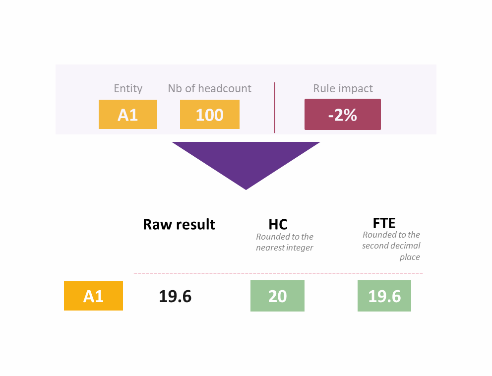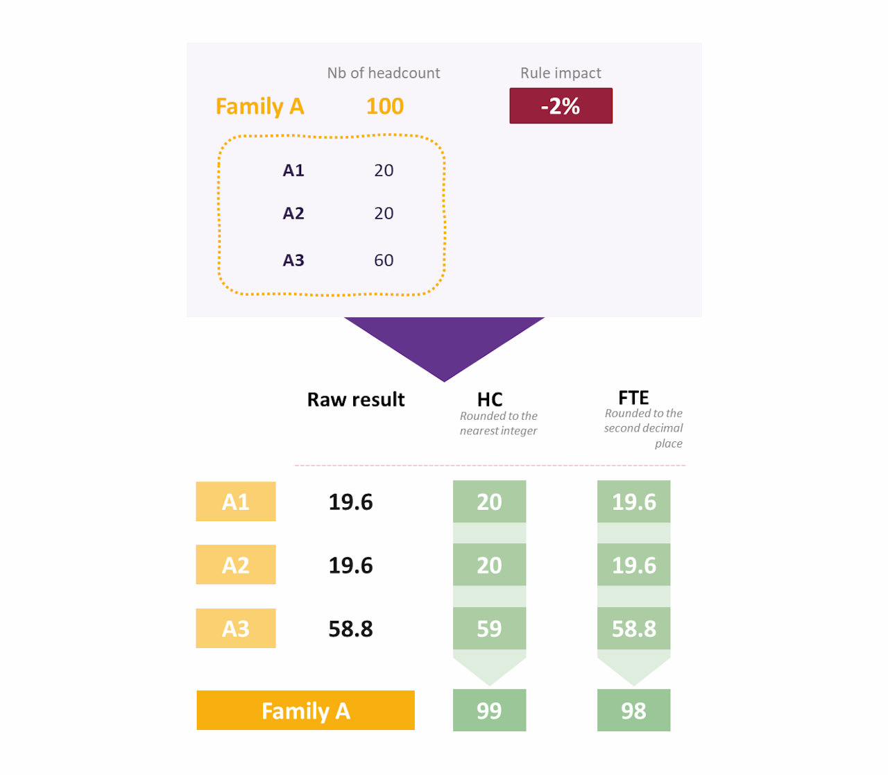 If you enter a percentage impact on a family of entities, Albert will in fact reflect this impact on all the sub-entities that make up this family. The results of each sub-entity are then rounded to the nearest integer if we are working in headcount, or to two decimals if we are working in FTEs, then aggregated to obtain the result for the family.