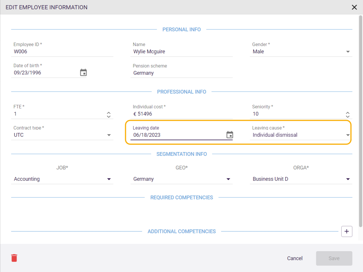 You can add or modify known leaving dates and causes in individual employee cards at any time.