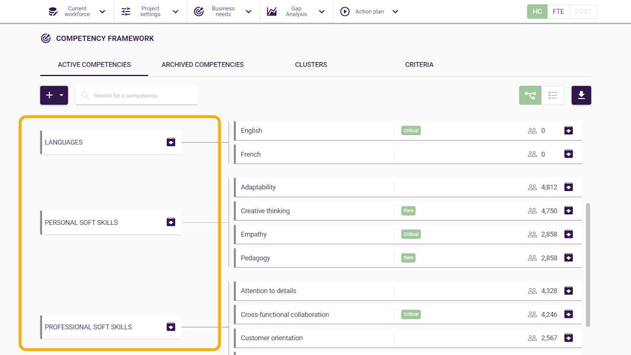 For example: the cluster Languages gather the competencies English, French, Spanish and German